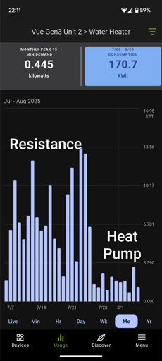 I recently installed an Emporia Vue with monitoring for the individual circuit my water heater is on. It captured the very significant difference in energy usage from replacing resistive heat with heat pump.
