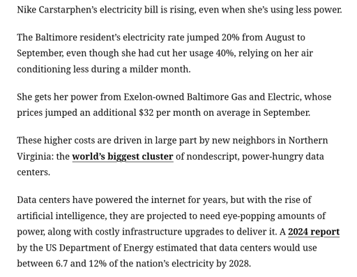That is what some of the tech companies are doing. For situations like the one in the article, that obviously isn’t the case, since rates are going up. If the tech companies are building and maintaining their own infrastructure for their outsized power needs, rates should either stay the same or fall (assuming that the tech company builds capacity to handle peak loads during LLM training and sells capacity during non peak loads). Rates going up in response to new data centers can only mean that the other grid users are subsidizing new capacity being added or buying energy from elsewhere at a higher rate.