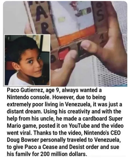 It’s from 2021. The kid did make the fake Nintendo from a box, but he wasn’t given a cease and desist letter, he wasn’t sued by Nintendo, and he also didn’t receive a Nintendo. Nothing else happened.