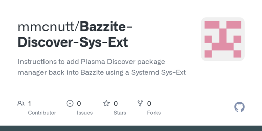 Instructions to add Plasma Discover package manager back into Bazzite using a Systemd Sys-Ext. Based on Travier’s Fedora Sys-Ext work at https://travier.github.io/fedora-sysexts/ and relies on his base images on quay.