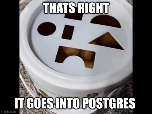 ☆ Yσɠƚԋσʂ ☆@lemmy.ml to Programmer Humor@lemmy.mlEnglish · 2 months agoIt goes into Postgreslemmy.mlimagemessage-square3fedilinkarrow-up174arrow-down11cross-posted to: programmer_humor@programming.dev