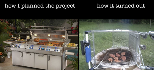 - You laugh at the shopping cart, but it works, and its better than raw uncooked meat. - Probably also a lot less likely to go overbudget if you just aim for that from the start. - … And I say this both as a programmer and as someone who has cooked a steak on a shopping cart. - Job market is pretty rough these days, ngl.