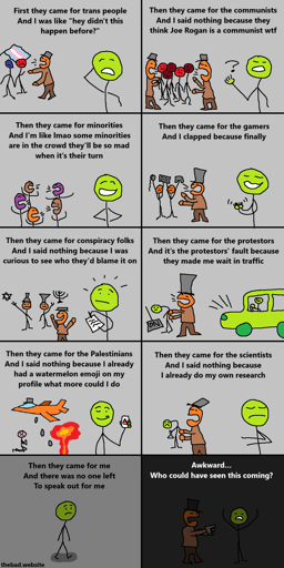 [green amused at colored pople bickering] Then they came for minorities And I’m like lmao some minorities are in the crowd they’ll be so mad when it’s their turn
