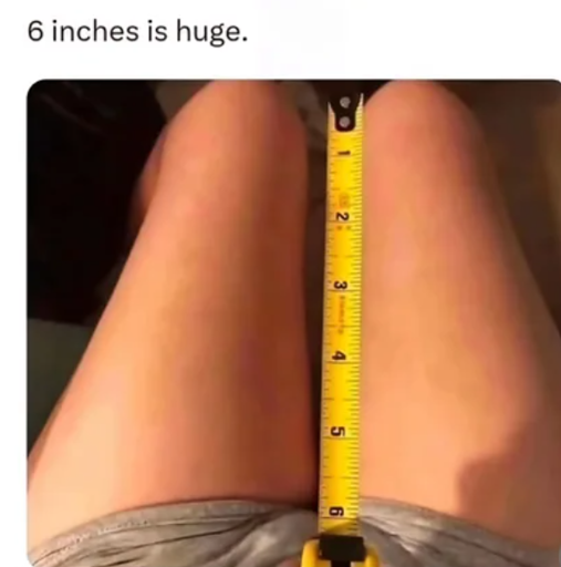minus-squaretomi000@lemmy.worldlinkfedilinkarrow-up1·10 days agoBecause her thigh would be 6" long. Or maybe shes a 10yo.