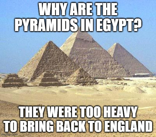 fu@libranet.de to Memes@sopuli.xyz · 13 days agoWhy are there pyramids in Egypt?blossom.primal.netimagemessage-square8fedilinkarrow-up1289arrow-down15file-text