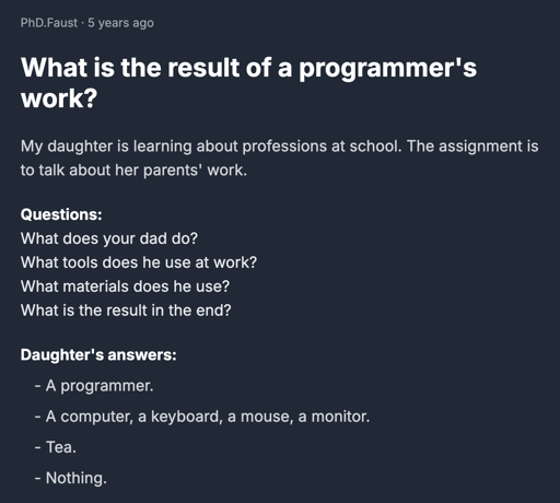 cm0002@sh.itjust.works to Programmer Humor@programming.dev · 2 months agoWhat is the result of a programmer's work?lemmy.mlimagemessage-square108fedilinkarrow-up1933arrow-down19cross-posted to: programmerhumor@lemmy.ml