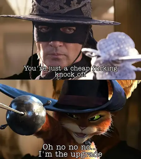 I got this joke backwards. Mask of Zorro came out when I was like, 10 so I didn’t see it until much later…after I’d seen Shrek 2. So throughout this live action Hollywood blockbuster I’m laughing that the main character sounds exactly like an orange cartoon cat.