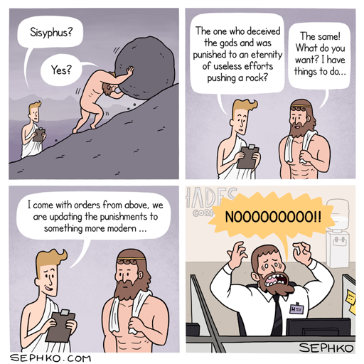Never thought about it, but yeah… Sisyphus would be shredded. 24/7 sitting behind a desk would fuck him up though.