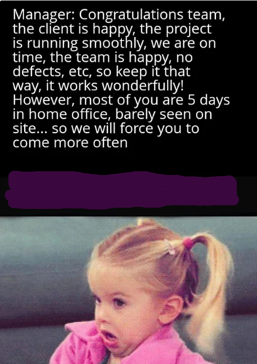 We were fully remote during the height of the pandemic. Right now we’re on a 3 days a week in office plan, except if you live further than 50km or 1h away. Some also have a grandfathered agreement. Then it’s a single day per week, where we discuss things as a team and grab lunch after. I think it’s nice to occasionally meet your colleagues, especially if you all work very closely together. Doesn’t even have to be once a week.