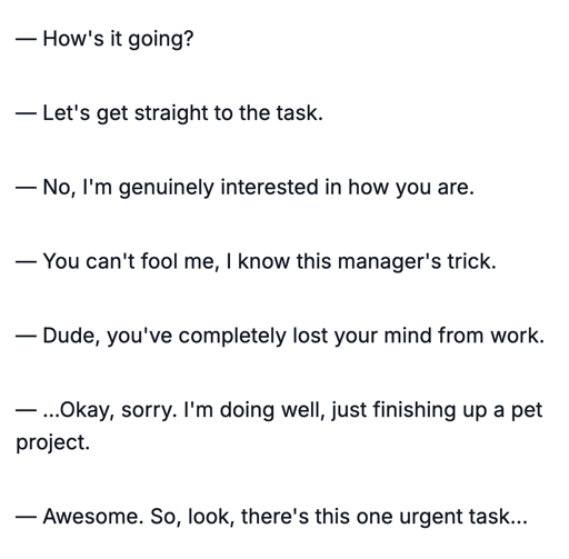 i call it the social handshake now and i allot an extra 10 minutes every single time i schedule a work meeting an wait to hear certain key words/phrases before continuing on for the actual reason why i scheduled the meeting. lol