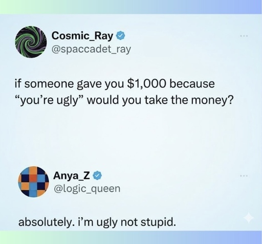 ickplant@lemmy.world to Lemmy Shitpost@lemmy.world · 13 days ago$1,000 richerlemmy.worldimagemessage-square40fedilinkarrow-up1980arrow-down16