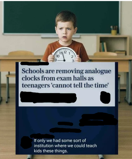 minus-squareCredibly_Human@lemmy.worldlinkfedilinkarrow-up3·1 day agoI doubt they are unable to read an analog clock. Most adults are. I am not able to read cursive though. Like I can guess enough of it, but I just don’t encounter it enough to remember it. Like imagine if you hadn’t tied a tie in 50 years. Would you still remember how? Its not a useful skill, and anyone who wants to learn can do so in a few minutes of searching.