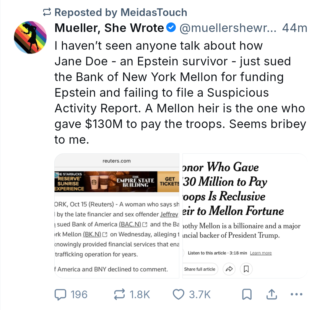 Billionaires care about that number because it equates to power and influence. This is a great example of that. The Trump Administration is effectively trying to bribe the military/ICE by keeping them paid during this shutdown while he waits for Democrats to cave when medical insurance premiums skyrocket and SNAP runs out and people start to starve. This leaves the population vulnerable for when Trump inevitably orders a purge of the American people.