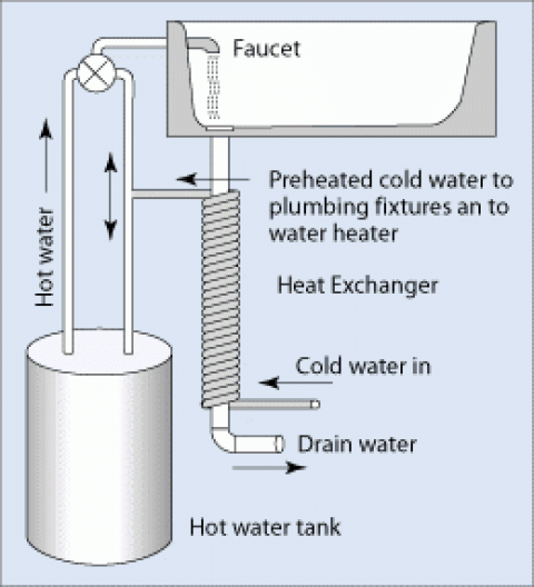 - A simple heat exchanger from the drain to the cold water running to the shower. A thermostat on the shower reduces the amount of hot water you use as the cold water gets warmer.