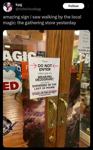 As a regular person, if I saw this I would be glad they were saying something. I wouldn’t associate myself with it because I know that I bathe regularly and don’t smell like rancid asshole. I spent a lot of time the game store in my town when I was a kid and mfers that couldn’t wash properly were absolutely a problem.