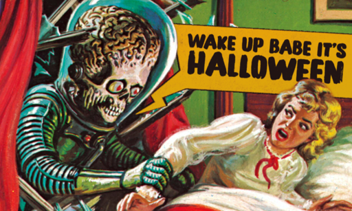 This artwork by Norm Saunders was created for the 1962 Mars Attacks trading card series from Topps. Based on sketches by Wally Wood and Bob Powell, Saunders painted the final image in oil for Card #17, “Beast And The Beauty”.
