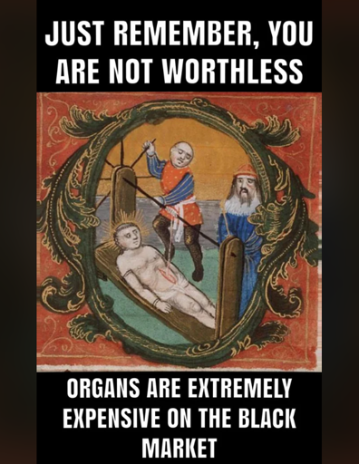minus-square𞋴𝛂𝛋𝛆@lemmy.worldlinkfedilinkEnglisharrow-up8·1 month agoYou really are worth less, as you are older than you were yesterday, and young organs sell for more.