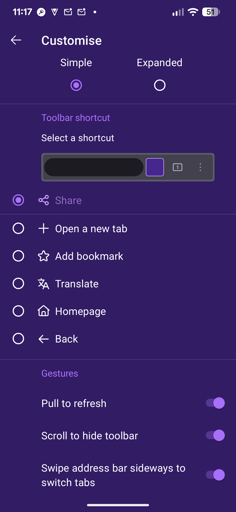 Ah cool, thanks! Unfortunately it looks like that’s only for the simple toolbar, and only a single shortcut. I’d love to at least replace the “Favourite” button with a “Forward” button on my second toolbar, but maybe later.