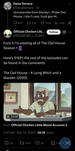 LiamBox@lemmy.ml to Piracy: ꜱᴀɪʟ ᴛʜᴇ ʜɪɢʜ ꜱᴇᴀꜱ@lemmy.dbzer0.comEnglish · 1 day ago'The Owl House’ creator Dana Terrace situation with Disney+ positive views on AI generated contentlemmy.mlimagemessage-square46fedilinkarrow-up1410arrow-down13