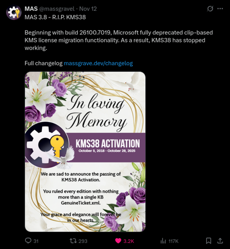 mr_MADAFAKA@lemmy.ml to Piracy: ꜱᴀɪʟ ᴛʜᴇ ʜɪɢʜ ꜱᴇᴀꜱ@lemmy.dbzer0.comEnglish · 2 months agoMicrosoft has blocked Massgrave's KMS38 activation method for Windowslemmy.mlimagemessage-square135linkfedilinkarrow-up1408arrow-down12file-text