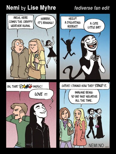 - Added the name of the strip and artist. I think the artist deserves a much higher profile in the US than she currently has. The line art of the goths in panels 2 and 3 is masterful, and the background goths in panels 1 and 4 show a perfect balance of minimalism and detail. Tellingly, the non-goths all look like caricatures of actual people rather than just generic cartoon characters. Importantly, this particular strip isn’t just going for a gag, it also aims to expess a truth about “dark culture” and its relationship to the world. Anyway I think the name of the cartoon and its artist deserves to be prominently placed on the image; this isn’t usually done on the images floating around the internet. (they often have the “nemi.no” url, but this forwards to a facebook page which doesn’t even mention the artist, and which only shows 2-3 entries before refusing to do any more unless you make a facebook account.)