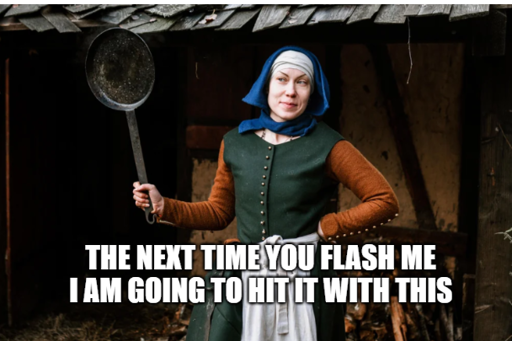 Plot twist. She doesn’t reduce the number of guys flashing her. She now attracts guys who get off on being hit in the nuts.