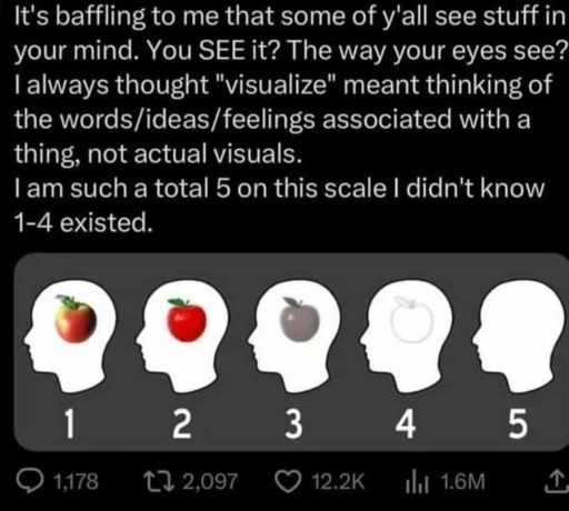 This one is a cluster fuck for me… I can visualize an object in my head and even to the point of placing it in real space in my hand and being able to rotate it. I cannot however, see your face in my mind after you have just left the room.