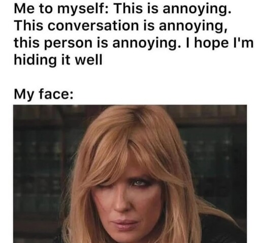 LadyButterfly she/her@piefed.blahaj.zone to Memes@sopuli.xyzEnglish · 2 days agoDo you have resting bitch face?piefed.cdn.blahaj.zoneimagemessage-square11fedilinkarrow-up1283arrow-down12