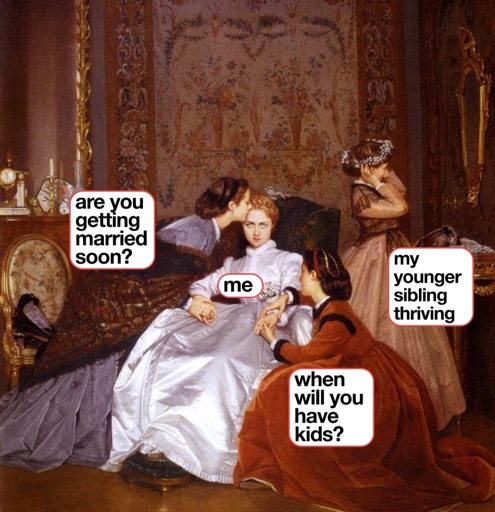 Up to 18 my mum was insistent that I be absolutely stable before having kids. Then until I was 25 she was riding me about grandkids. That ended when I flipped my shit and told her to fuck off with that. Now I’m spitting distance from 40 and in a way wish I’d settled down earlier. Fertility struggles fucking blow.