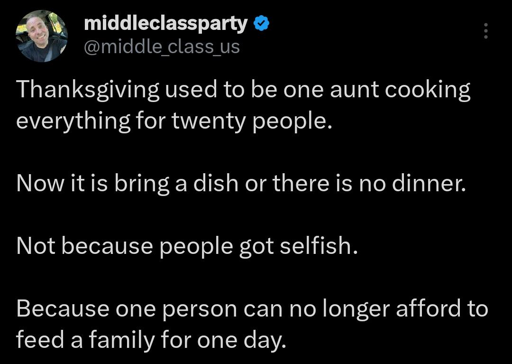 I do host thanksgiving for more than 20 usually, we do an all-comers meal, whoever wants to come to eat can. It’s fun and I enjoy it and yep everyone brings something but even so it is expensive for certain. Legitimately thankful that we can do this for everyone. But even when I was younger people coming to Thanksgiving brought something, is that not a usual expectation if you are going to a party? At least bring wine or ice or something.