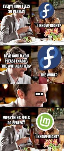 Now Fedora has edged a bit more practical and proactively let’s users know about how to add proprietary stuff and the wifi industry takes Linux seriously, if not for desktop use then for all the embedded use cases they would be left out of without good Linux support. Fedora is still a bit far on the ‘purist’ side still (try to play a lot of media using dnf provided software, it will tend to break), but not as hard as it used to be)