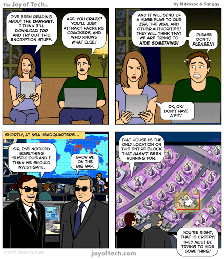 I agree. But I’ll also add that the joke itself should be pretty accessible even outside the IT crowd. It’s said clearly in the text of the final panel, and even in the title of the post. The only thing an average person might not know to get the joke is that you use TOR to get on the darknet, but I think most people would figure that out from the context.