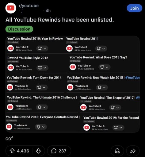 vcokltfre@lemmy.world to Mildly Infuriating@lemmy.worldEnglish · 3 months agoApparently, all YouTube Rewinds have been unlisted as of today.lemmy.worldimagemessage-square77linkfedilinkarrow-up1531arrow-down114