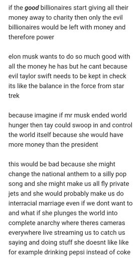 elon musk wants to do so much good with all the money he has but he cant because evil taylor swift needs to be kept in check its like the balance in the force from star trek