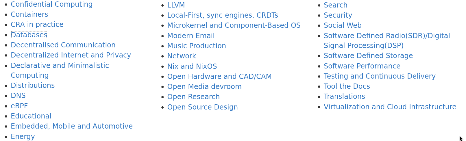The vast majority of events (talks, hacking sessions, open discussions) are held inside “developer rooms” (“devrooms”), which are mini-conferences organized and managed by open source projects themselves.