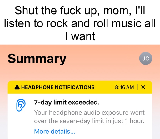 minus-squareJomega@lemmy.worldlinkfedilinkarrow-up3·1 month agoIf they were really concerned about me damaging my ears, why not make the maximum volume lower than that?