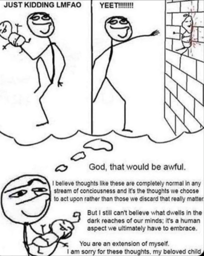 This hit a little closer to home than it might have to others. When my son was born in December 2019, one of the first nights I had him alone so my wife could visit a friend, I found myself unable to keep him from crying. At one point an intrusive thought of yeeting him down the stairs popped into my mind and horrified me. I wept alongside him and felt terrible. Told my wife and later my therapists about it.