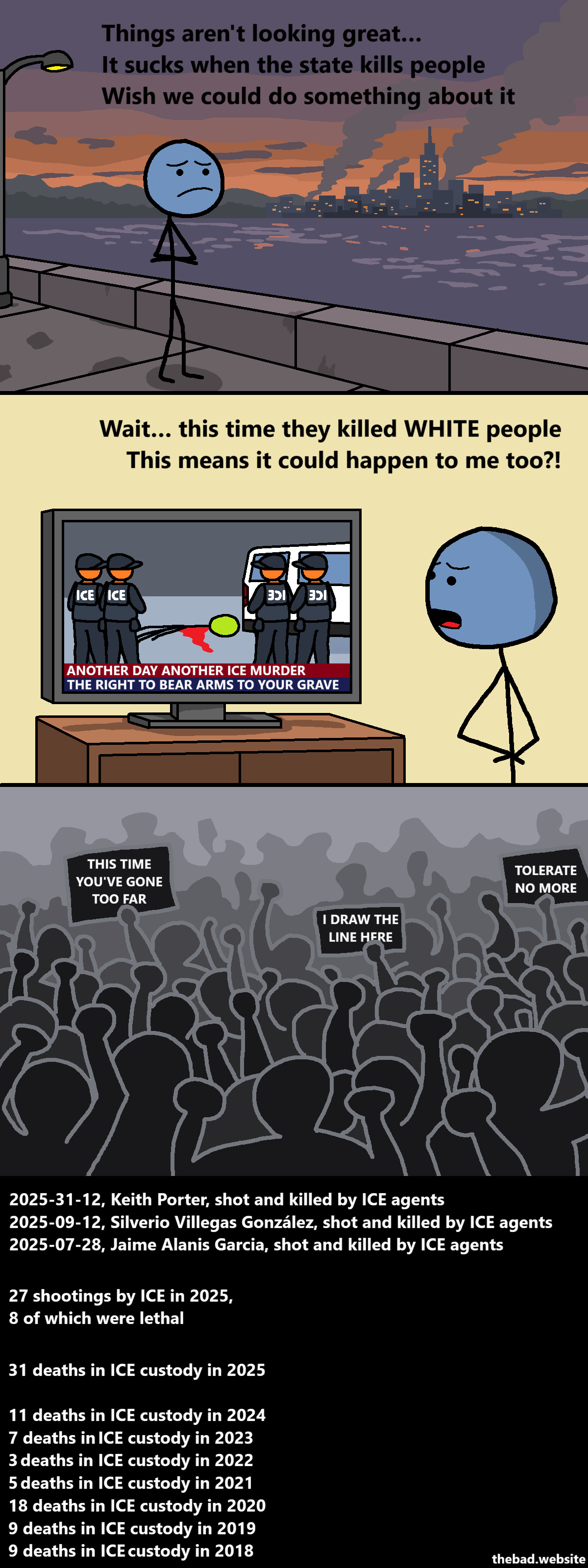 This is about people who were aware of the situation and dismissed, minimized, ignored it. Which is a lot of people. People I’ve been having interactions with for the past decade. It isn’t about you. But there’s still a lesson to be learned here: how come it hasn’t reached you, and what can we change on a structural level to make sure this reaches people widely when it inevitably happens again. There’s an actual conversation to be had, and the topic isn’t guilt, it’s stopping the death machine.