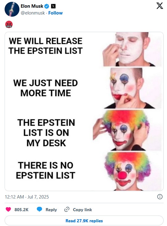 Never been a fan of Musk even before his Sieg Heil moment during the elections but this does nicely top it off. Will there ever be an investigation into all these wealthy men who abused young women? Probably not. Let’s not kid our selves though, wealthy were never bound by laws, not now and not in the past thousands of years
