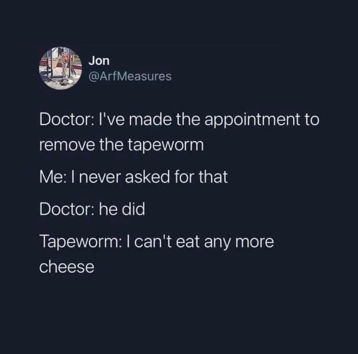 Dumbass tapeworm, don’t you know how expensive cheese is? Fucker should be grateful