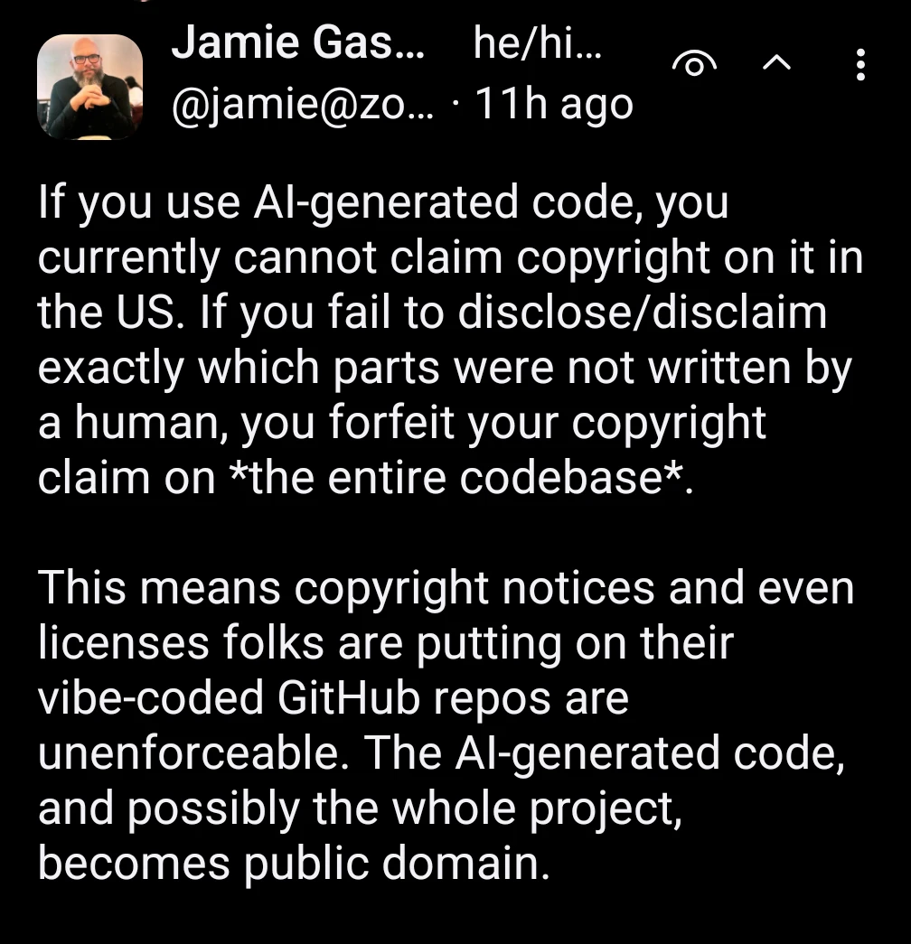 minus-squarericecake@sh.itjust.workslinkfedilinkarrow-up20·2 days agoThat’s not what that research document says. Pretty early on it talks about rote mechanical processes with no human input. By the logic they employ there’s no difference between LLM code and a photographer using Photoshop.