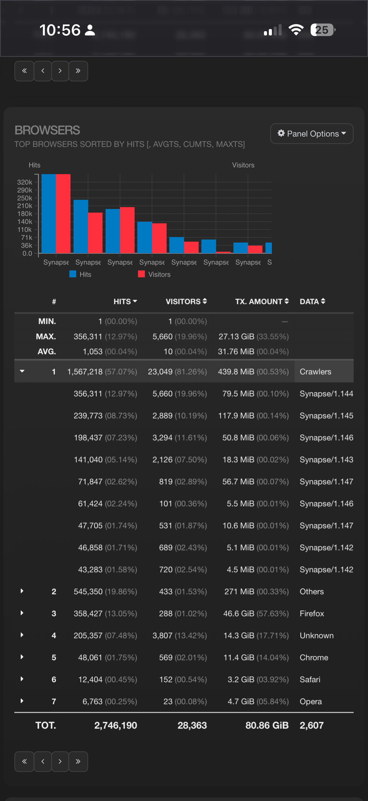 Finally fixed my GoAccess today to be surprised to see Synapse hits labelled as crawlers, well over a million hits.