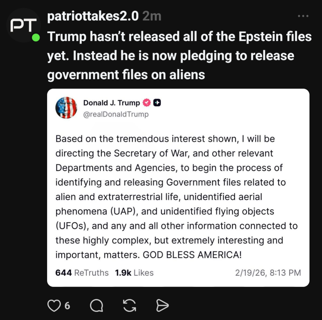 MTZ@lemmy.world to Lemmy Shitpost@lemmy.world · 3 days agoThis MF is quadrupling down and dropping Alien files before dropping the full, unredacted Epstein Files. GODDAMN.imagemessage-square213linkfedilinkarrow-up11.02Karrow-down112