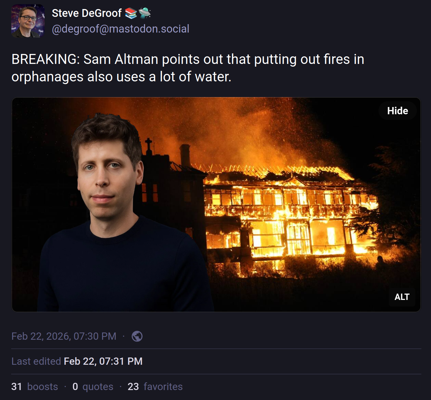 arrow-up11.18Karrow-down1imageBREAKING: Sam Altman points out that putting out fires in orphanages also uses a lot of water.STHayden@piefed.social to Memes@sopuli.xyzEnglish · 3 days agomessage-square74linkfedilink